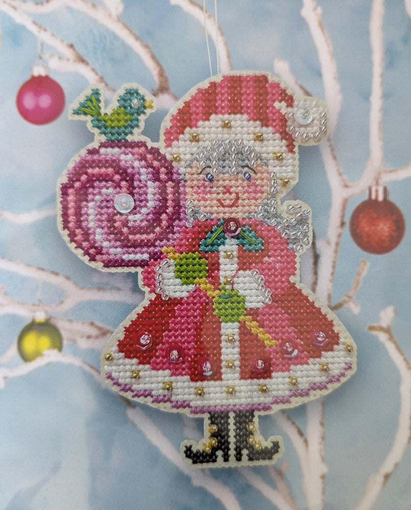 Lolly Claus by Satsuma Street is a kit that includes the chart, 14 count perforated paper, DMC embroidery floss, beads, sequins, a tapestry needle, and finishing instructions.