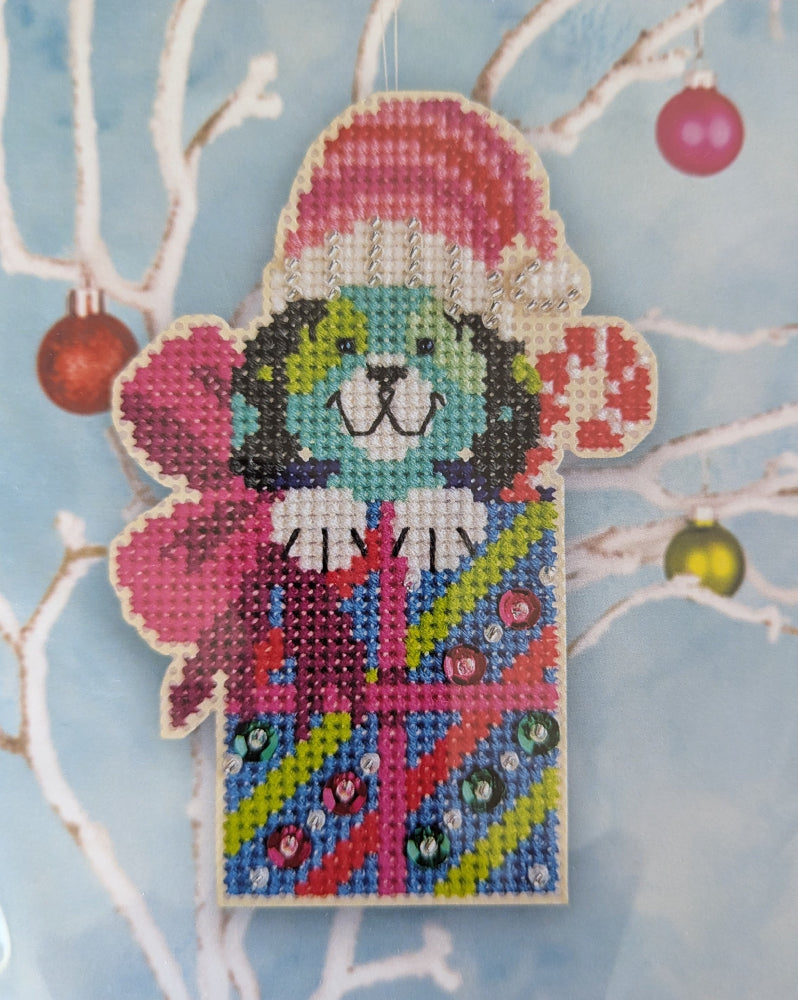 Puppy Present by Satsuma Street is a kit that includes the chart, 14 count perforated paper, DMC embroidery floss, beads, sequins, a tapestry needle, and finishing instructions.